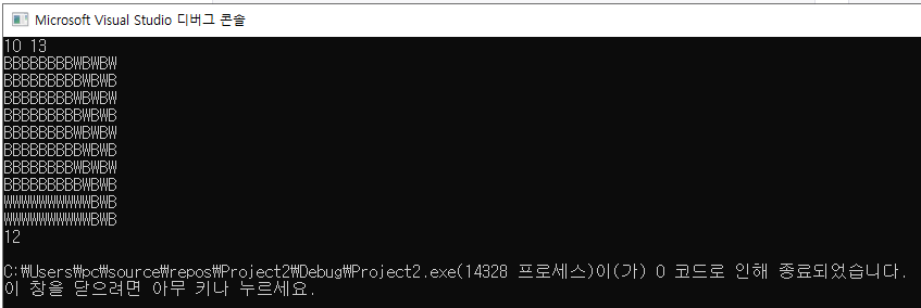첫째 줄에 N과 M이 주어진다. N과 M은 8보다 크거나 같고, 50보다 작거나 같은 자연수이다. 둘째 줄부터 N개의 줄에는 보드의 각 행의 상태가 주어진다. B는 검은색이며, W는 흰색이다.