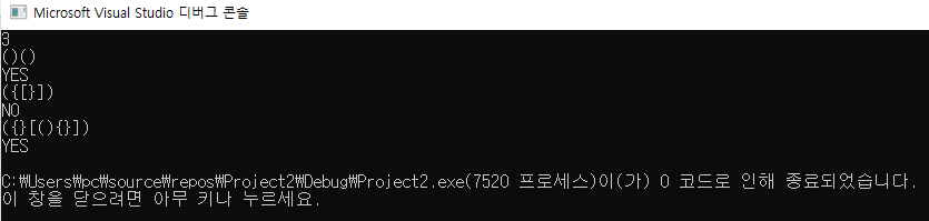 마지막으로 입력받은 괄호 문자열의 끝까지 탐색했다면 스택이 비어있는지 확인 후 비었을 경우 "YES", 비어있지 않을 경우 "NO"를 반환하도록 구현하였다.