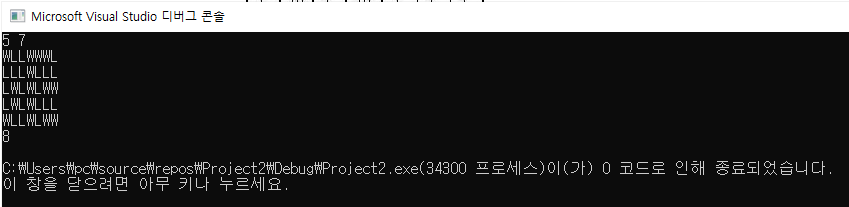 첫째 줄에는 보물 지도의 세로의 크기와 가로의 크기가 빈칸을 사이에 두고 주어진다. 이어 L과 W로 표시된 보물 지도가 아래의 예와 같이 주어지며, 각 문자 사이에는 빈 칸이 없다. 보물 지도의