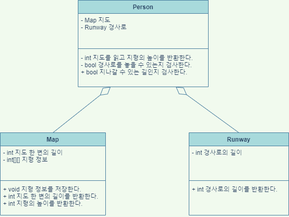 문제를 풀기에 앞서 문제에서 주어진 지도와 경사로, 그리고 지도와 경사로를 이용해 지나갈 수 있는 길인지 파악하는 역할을 하는 사람을 클래스 다이어그램으로 표현하였다.