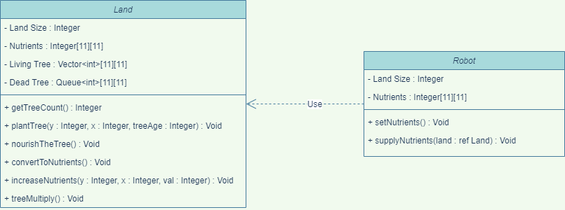 로봇은 땅에 양분을 공급하는 역할을 수행한다. 따라서 Robot 클래스의 supplyNutrients() 메서드에서 Land 객체의 레퍼런스 타입을 매개변수로 받아 Land 클래스의 increaseNutrients() 메서드를 호출하여 땅에 양분을 공급하도록 설계하였다.