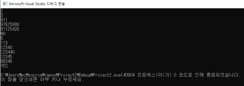 첫째 줄에 테스트 케이스의 개수 t가 주어진다. (1 ≤ t ≤ 50) 각 테스트 케이스의 첫째 줄에는 전화번호의 수 n이 주어진다. (1 ≤ n ≤ 10000) 다음 n개의 줄에는 목록에 포함되어 있는 전화번호가