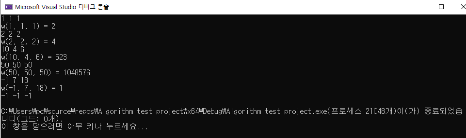 cout << "w(" << a << ", " << b << ", " << c << ") = " << dp(a,b,c) << '\n';