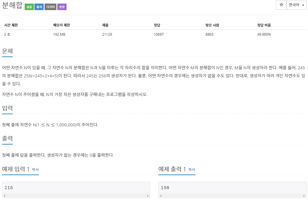 1~N까지 완전탐색을 돌려도 시간 제한에 걸리지 않는 문제지만 생성자의 한가지 규칙을 발견하여 적용시켰다.